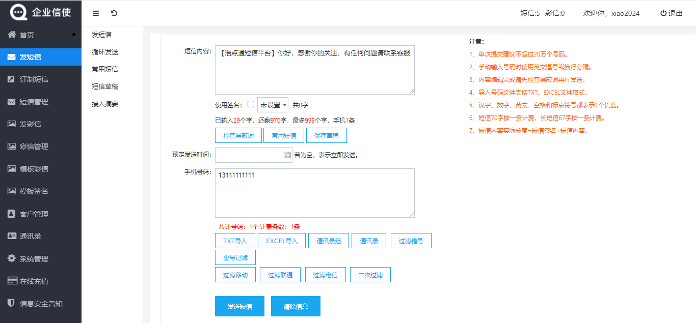 電腦PC端發(fā)送短信平臺具有操作便捷,數(shù)據(jù)處理能力強(qiáng),發(fā)送統(tǒng)計(jì)查看方便等優(yōu)勢。 方便用戶編輯客戶號碼,短信文案,為客戶提供一種方便快捷的短信發(fā)送解決方案。 市場平臺那么多